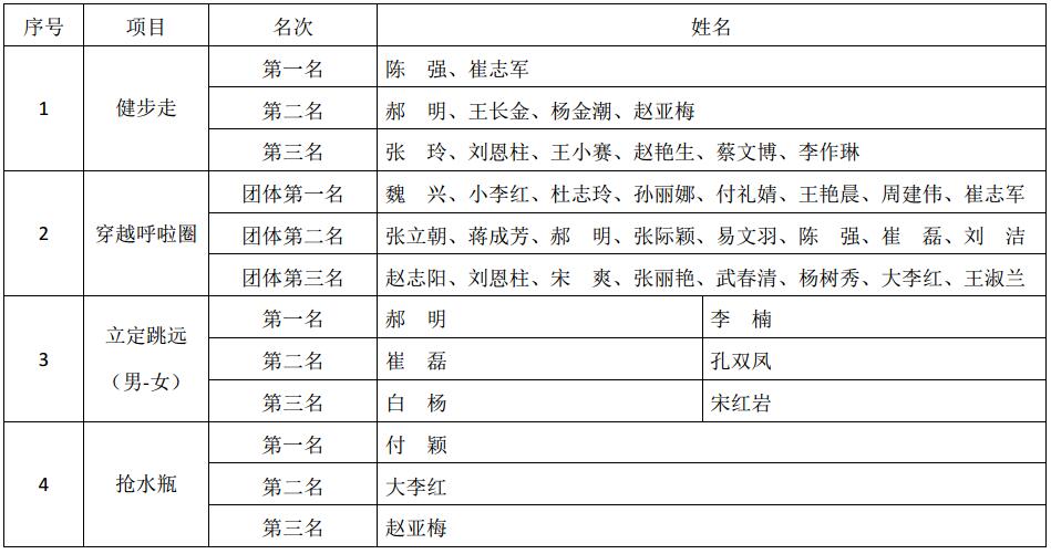 最后活動(dòng)結(jié)束前,還特邀了四個(gè)比賽項(xiàng)目冠軍獲得者為堅(jiān)守崗位而未能參加活動(dòng)的項(xiàng)目部人員,抽取了幸運(yùn)獎(jiǎng)是:何慶林、黃北金、崔敬安、高凱、宋秀錦、常國(guó)恒;另外,現(xiàn)場(chǎng)員工和體育場(chǎng)參加鍛煉的市民為公司機(jī)關(guān)部室人員,抽取了幸運(yùn)人員是:胡宇灼、劉靜、霍開強(qiáng)、郭帥、王志媛、許靖。